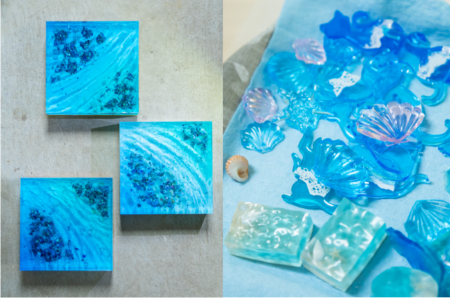 山下 私もです(笑)。作業工程を見直せば、波の表現をもっと美しく仕上げることは可能かなと思います。あとは技術的なところで、レジンの色をもう少し薄くしてより透明感のある波の表現にしようと思っています。ほかに、アイデアとしては、ゴールドを入れたり、異なる色を組み合わせたりすれば、もっとオリジナル感が出せそう。次の試作で、そのあたりも試してみますね。