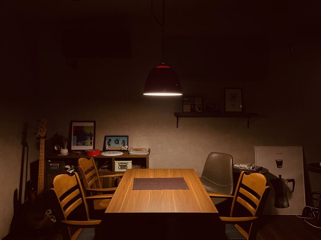灯りがテーブルを包み込み、天井にはやわらかな輪の光が浮かびます。